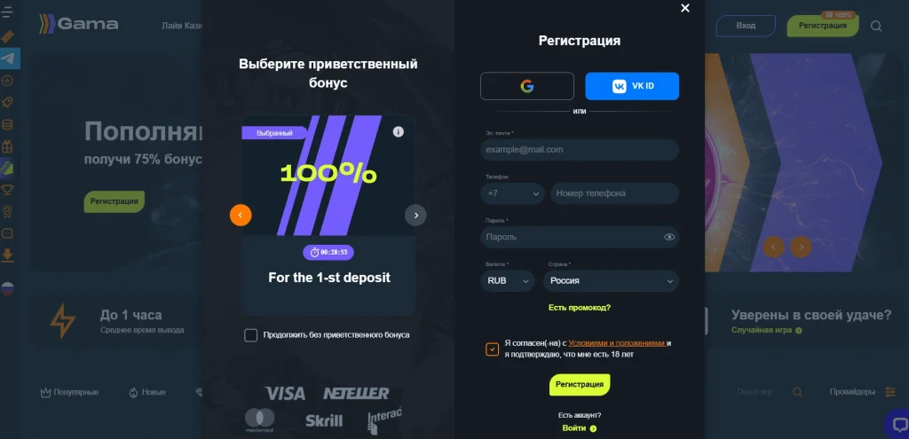 Каждая игра начинается с ключевого шага — создания аккаунта. В Гамма Казино этот процесс устроен максимально просто: без лишних проверок, без ожидания. Регистрация открывает доступ к бонусам, турнирам и выводу средств. Кроме того, в Гама Казино бонус за регистрацию представлен в двух форматах: удвоение депозита или пакет бесплатных вращений за депозит.