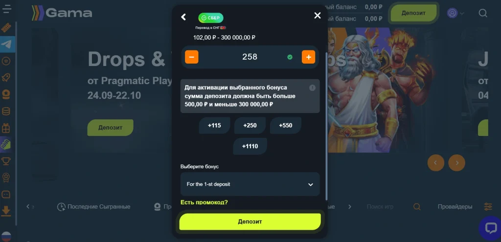 В Гама Казино вывод денег устроен симметрично, но с другими границами. Минимум — 300 рублей, максимум — 5 миллионов рублей. СБП удерживает 3% комиссии, остальные методы работают почти без потерь. Среднее время поступления выигрыша — около часа, иногда быстрее.